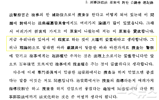 일제가 만들어 놓은 검찰의 수사·기소권 독점은 54년 형소법 제정당시부터 논란이 됐다. 54년 1월 9일 형사소송법 초안에 대한 공청회 속기록을 보면 당시 한격만 검찰총장도 수사·기소권 분리가 법리상으로는 타당하다는 의견을 피력했다. 하지만 한국전쟁이후 사회혼란을 이유로 검찰에 양대 권한을 부여하는 내용으로 형소법이 제정됐다. (사진=형사정책연구원 '형사소송법제정자료집')
