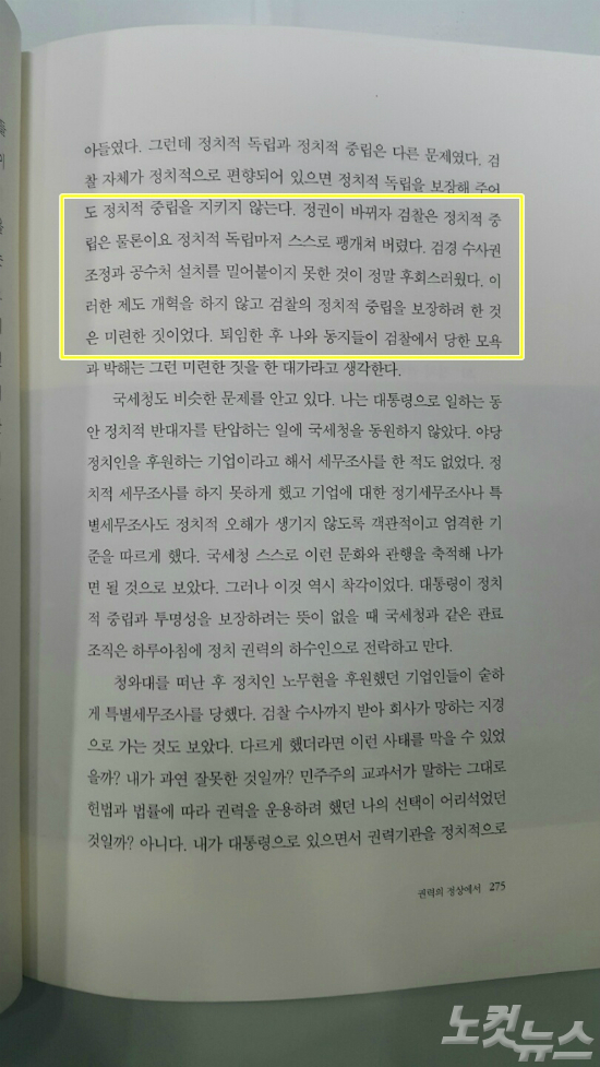 검찰개혁을 완수하지 못한 후회가 묻어나 있는 노무현 대통령의 자서전 '운명이다' 275쪽. (사진='운명이다')