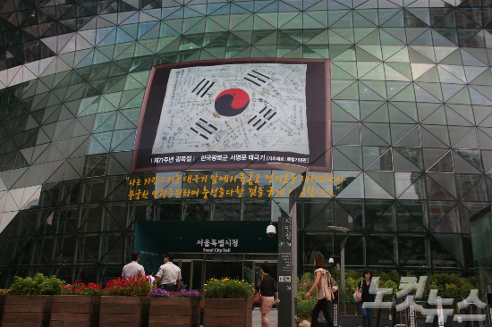 서울시는 올해 제71주년 광복절을 맞아 '한국광복군 서명문 태극기'(등록문화재 제389호)를 그대로 재현한 대형 태극기(18m☓13m)를 청사 외벽에 설치했다.