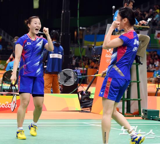 배드민턴 정경은, 신승찬 선수가 15일 오전(현지시간) 브라질 리우데자네이루 바하 리우센트로 파빌리온4 경기장에서 열린 2016 리우올림픽 배드민턴 여자복식 8강전에서 네덜란드 에이피에 무스켄스, 셀레나 픽을 상대로 득점 후 환호하고 있다.