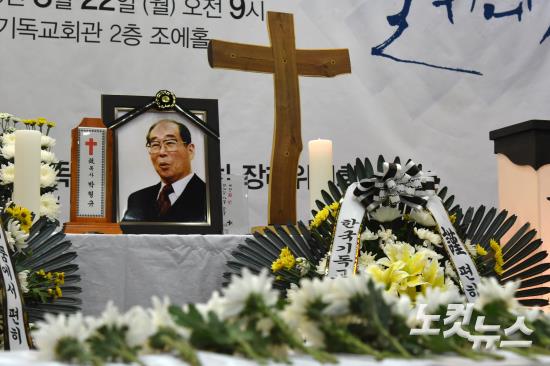 22일 오전 종로구 한국기독교회관에서 평생 민주화를 위해 헌신한 개신교계의 원로 고(故) 박형규 목사의 영결식이 한국기독교장로회 총회장으로 거행되고 있다.