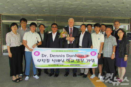 1973년부터 75년까지 광주무진중학교(김우빈 교장)에서 평화봉사단 원어민 교사로 재직했던 오클라호마 주립대 데니스 던햄(Dr. Dennis Dunham·한국명 남덕수) 교수와 당시 재학했던 선배들이 40여 년 만에 모교를 방문했다.