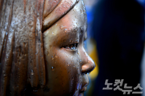 한국정신대문제대책협의회 등 시민단체들이 '12.28 한일합의 강행 규탄 및 정의로운 해결을 촉구하는 기자회견을 진행한 31일 서우 종로구 구 주한일본대사관 앞에 자리한 평화의 소녀상이 비에 젖어 있다. (사진=박종민 기자)
