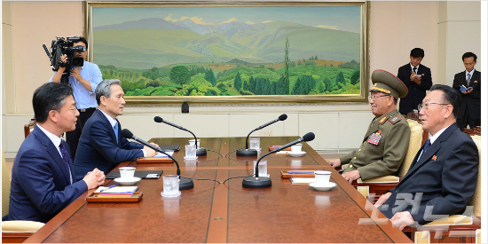 남북 고위급 접촉 북측 대표로 나온 김양건 당 비서(오른쪽 첫째)(사진=통일부)