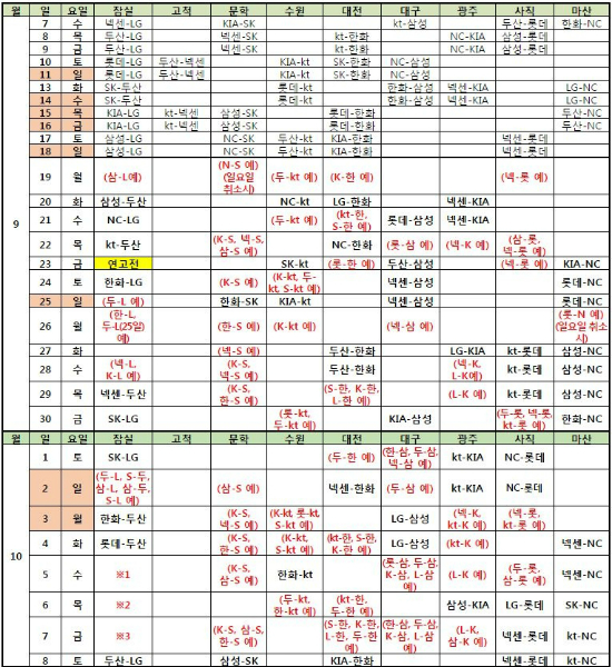 한국야구위원횐(KBO)는 7일 올해 우천으로 인해 치르지 못한 '2016 타이어뱅크 KBO 리그'의 총 55경기에 대한 일정을 확정·발표했다. 이 경기들은 오는 20일부터 다음달 8일까지 진행된다.