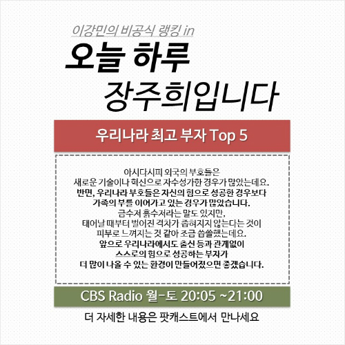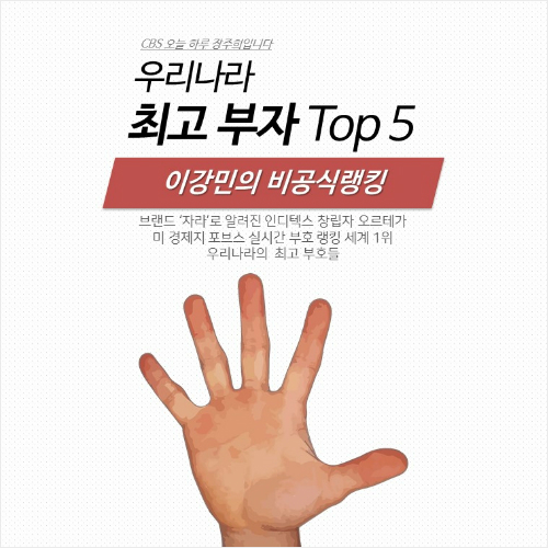 = 오늘 미 경제지 포브스가 인터넷판에 게재하는 실시간 부호 랭킹에서 ‘자라’라는 브랜드로 잘 알려진 의류업체 인디텍스의 창립자 오르테가가 빌게이츠를 제치고 세계 1위에 올라 화제가 됐습니다. 오르테가의 순 자산은 769억 달러, 우리 돈으로 96조 7천억 원이나 된다고 하는데요. 이렇게 외국 부호의 이야기를 들으면 우리나라의 부호가 누구인지 궁금해지죠. 그래서 오늘은 ‘우리 나라 최고 부자 Top 5’를 살펴보려고 합니다.