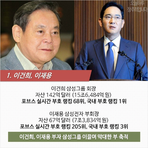 = 아마 많은 분이 이분들의 이름을 가장 먼저 떠올리셨을 것 같습니다. 바로 이건희 삼성그룹 회장과 이재용 삼성전자 부회장인데요. 이건희 삼성그룹 회장은 142억 달러, 우리 돈 15조6,484억 원의 자산으로 포브스 실시간 부호 랭킹 68위, 국내 부호 랭킹 1위를 차지하고 있고요. 이재용 삼성전자 부회장은 67억 달러, 우리 돈 7조3,834억 원의 자산으로 포브스 실시간 부호 랭킹 205위, 국내 부호 랭킹 3위를 차지하고 있습니다. 이건희, 이재용 부자는 삼성그룹을 이끌며 막대한 부를 축적해 왔는데요. 삼성그룹의 핵심이라고 할 수 있는 삼성전자는 올 2분기 지난해 같은 기간에 비해 18%p나 급증한 8조 1,400억 원의 영업이익을 달성하기도 했습니다.