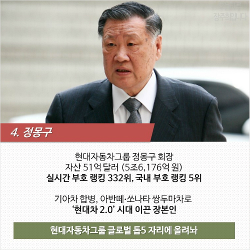 = 현대자동차그룹 정몽구 회장도 한국의 대표적인 부호입니다. 정 회장은 51억 달러, 우리 돈 5조6,176억 원의 자산으로 포브스 실시간 부호 랭킹 332위, 국내 부호 랭킹 5위를 차지하고 있는데요. 정 회장은 2014년 만 해도 세계 170~190위대를 지켰지만, 수출 부진과 국내 중·대형차 시장 점유율이 하락하면서 자산이 감소했다고 합니다. 정 회장은 기아차 합병과 아반떼·쏘나타를 쌍두마차로 고(故) 정주영 현대그룹 명예회장과 정세영 전(前) 현대차 명예회장에 이어 ‘현대차 2.0’ 시대를 이끈 장본인인데요. 덕분에 현대자동차 그룹은 글로벌 톱5 자리에 오를 수 있었습니다. 1938년생인 정 회장은 지금도 노구를 끌고 해외시장 개척에 직접 나서고 있습니다.