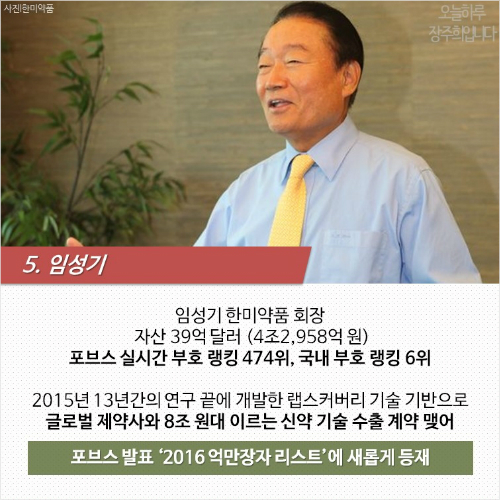 = 부호 랭킹에 새롭게 이름을 올린 사람도 있습니다. 바로 임성기 한미약품 회장인데요. 임 회장은 39억 달러, 우리 돈 4조2,958억 원의 자산으로 포브스 실시간 부호 랭킹 474위, 국내 부호 랭킹 6위에 이름을 올렸습니다. 서울 종로 5가에 자신의 이름을 내건 약국으로 첫 출발을 한 임 회장은 이후 동료 약사들과 함께 ‘한미약품’이라는 제약사를 설립하고 사업 규모를 확장해 나갔는데요. 지난해 13년간의 연구 끝에 개발해낸 랩스커버리 기술을 기반으로 글로벌 제약사들과 8조 원대에 이르는 신약 기술 수출 계약을 성사시키며 부호의 대열에 올랐습니다. 최근 임 회장은 그룹 관계사와 100억 원을 출자해 창업투자회사 한미벤쳐스를 설립하고 신약개발 생태계 조성에 힘쓰겠다고 밝혔습니다.