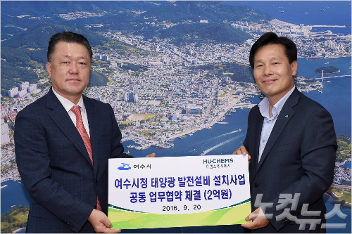 이번 협약에 따라 휴켐스는 2억원을 들여 시청사 남측 주차장 중앙 인도블럭 좌측에 70KW급 태양광 발전설비를 설치해 여수시에 무상 기증하게 된다.