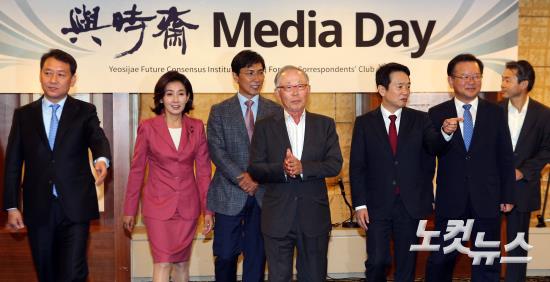 21일 오후 서울 중구 프레스센터에서 열린 한·미·중·일·러 전문가들 협력 방안 논의 재단법인 ‘여시재(與時齋)’ 미디어데이 참석자들이 기념촬영 후 자리로 돌아가고 있다. 왼쪽부터 이광재 운영부원장, 새누리당 나경원 의원, 안희정 충남도지사, 이헌재 여시재 이사장, 남경필 경기도지사, 더불어민주당 김부겸 의원, 이창호 외신기자클럽 회장.
