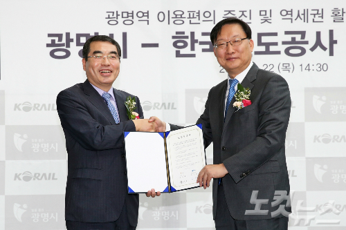 양기대 광명시장은 22일 KTX광명역에서 홍순만 코레일 사장과 KTX광명역 이용편의 증진 및 역세권 활성화를 위한 업무협약(MOU)을 체결했다.