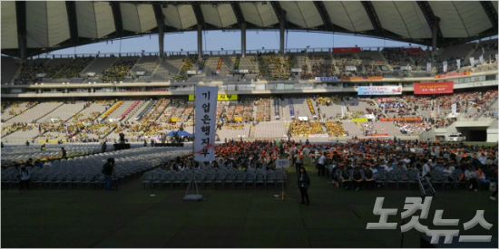금융노조는 이날 오전 9시부터 서울 마포구 상암동 서울월드컵경기장에서 금융노조 추산 5만 명, 정부 추산 2만 명 정도가 참석한 가운데 총파업 집회를 열었다. 노동가요 배우기, 구호 연습 등의 사전 행사를 거쳐 오전 11시가 넘어서 본격적인 총파업 선포식이 열렸다.