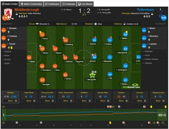 유첩축구 통계전문사이트 '후스코어드닷컴'은 미들즈브러와 원정경기에서 혼자 두 골을 몰아치며 토트넘의 2-1 승리를 이끈 손흥민에 만점에 가까운 9.75점의 높은 평점을 줬다.(사진=후스코어드닷컴 공식 홈페이지 갈무리)