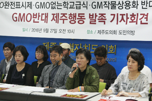 유전자변형농산물(GMO) 반대 제주행동은 27일 오전 제주도의회 도민의방에서 기자회견을 열어 GMO 반대 완전표시제와 상용화 반대를 촉구했다.
