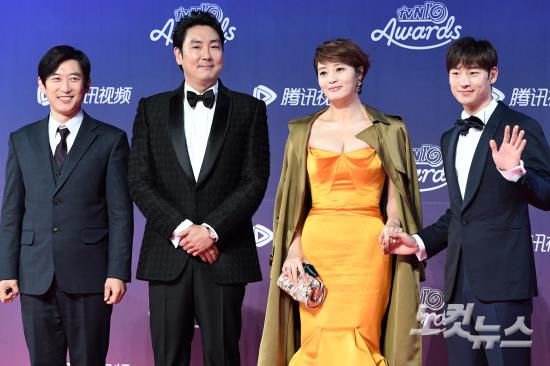 드라마 '시그널'의 김원해(왼쪽부터), 조진웅, 김혜수, 이재훈이 9일 오후 경기도 고양시 일산킨텍스 제2전시장에서 열린 tvN10 어워즈에서 포즈를 취하고 있다.