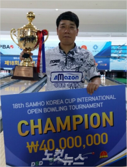 '실감이 나지 않네요' 채준희가 10일 삼호코리아컵 국제오픈볼링대회에서 데뷔 후 처음으로 메이저 대회 우승을 차지한 뒤 포즈를 취하고 있다.(안양=노컷뉴스)