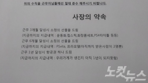 또한, 근무 3개월, 6개월, 1년 달성시 운동화·화장품세트·항공권 등 소정의 선물을 제공한다는 '사장의 약속'도 함께 적혀 있다.