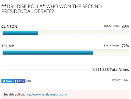 '드러지 리포트'가 홈페이지에 개설한 온라인 투표의 결과는 한국 시간으로 11일 오전 11시 현재 110만 이상의 투표수가 기록된 가운데 트럼프가 이겼다는 응답이 72%를 차지한 것으로 나타나 있다.