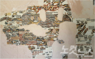 한 모자이크 공예품 상점 벽에 장식된 ‘성 조지(St.George)’ 교회의 성서지도 모형. 지도에는 사해, 요단강, 예수님 세례 터 등의 위치와 출애굽과 같은 성경의 중요한 사건들, 그리고 베냐민지파를 비롯한 12지파의 위치가 표기돼있다.