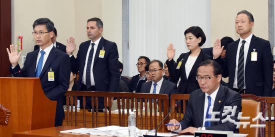 12일 국회에서 열린 안전행정위원회 국정감사에 (좌측부터)김흥렬 KT&G 부사장, 토니 헤이워드 BAT코리아 대표이사, 강유선 JTI코리아 대외홍보이사, 정일우 한국필립모리스 대표이사가 증인으로 출석해 선서를 하고 있다.