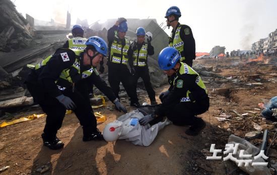 19일 오후 서울 상일동 고덕주공3단지 일대에서 실시된 지진방재 종합훈련에 참가한 경찰들이 건물 잔해 속 인명구조를 하고 있다.
