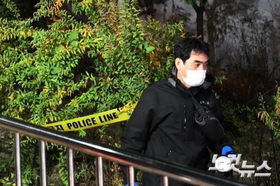 서울 강북구 번동 오패산 터널 인근에서 총기사고가 발생한 19일 오후 과학수사 요원들이 현장조사를 하고 있다.