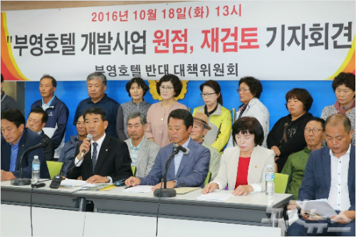서귀포시 중문동과 대포동 주민들로 구성된 '부영호텔 개발사업 반대대책위원회'는 "중요 지질자원인 주상절리대는 현재 모습 그대로 보존해야 하고, 어떤 형태의 개발 사업도 반대한다"며 부영호텔 건설계획에 따른 행정절차를 원점에서 재검토하고, 계획 자체를 철회할 것을 요구했다.
