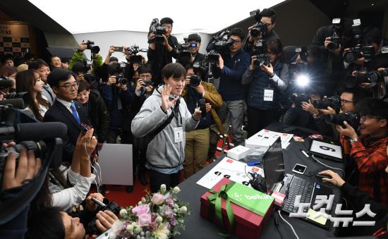 아이폰7 공식 출시일인 21일 오전 서울 광화문Kt스퀘어에서 1호 개통자인 유병문 씨가 새로운 아이폰을 들고 있다..