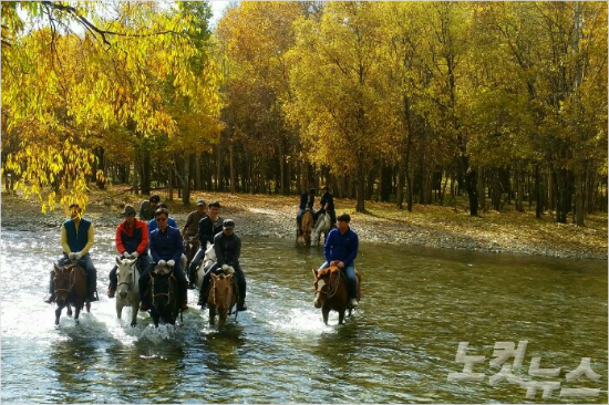 소리를 지르며 20분여 말과 씨름하다 보니 어느새 개울가를 건너고, 광활한 초원 위로 내리쬐는 태양 빛과 단풍이 든 나무의 가을 풍경을 달리고 있는 말 위에서 감상하고 있었다.