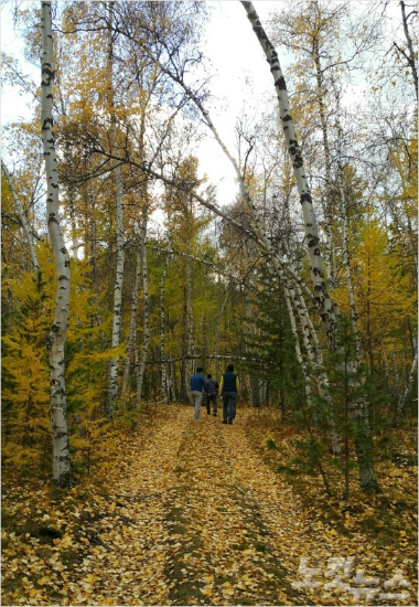 여기서 잠깐. 게르로 이동하는 사이 잠시 테를지 공원 내 자작나무 숲에 내려 노랗게 물든 낙엽길을 사뿐히 거닐어 보자.
