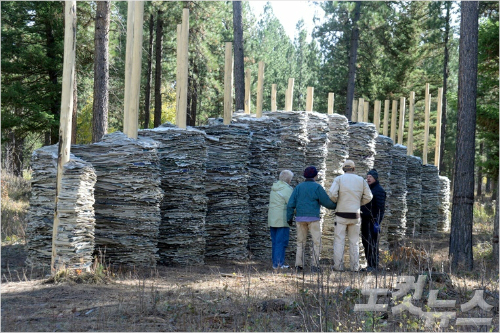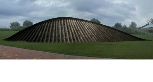 ▲ 한국의 원로 작가 이승택의 '기와입은 대지'구릉 위에 거대하게 설치되는 이 작품은 경주 지역의 역사의 숨결을 지니고 있는 고기와들을 재료로 삼아 거대한 자연의 언덕과 같은 형태로 만든 기와지붕 작품이다. 한국의 건축이라는 것이 자연에 대립하지 않고 자연과 더불어 숨 쉬는 공간이라는 것을 대외적으로 천명하는 작품이 될 것이다.