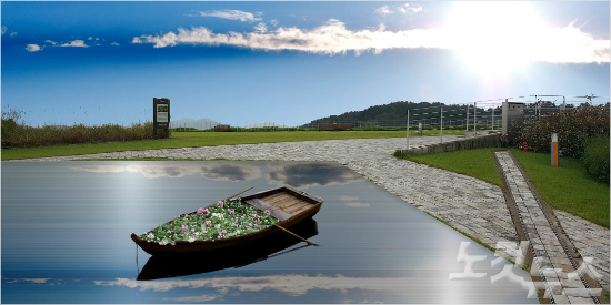 ▲ 김구림 작가의 '음과 양 2016' <부제 : 하늘거울>부제>거울처럼 사물을 반영하는 넓은 스테인리스 판을 배경으로 그 위에 올라서 있는 오래된 폐선과 그 안에 한가득 심어 놓은 꽃들은 우리가 이전에 추억처럼 떠 올리는 자연의 서정적 심미감을 보여 주기에 족하다. 관객들에게는 마치 스테인리스 스틸 판 위에 비친 하늘을 배경으로 배 한 척이 실제로 유람하고 있는 듯이 보인다.