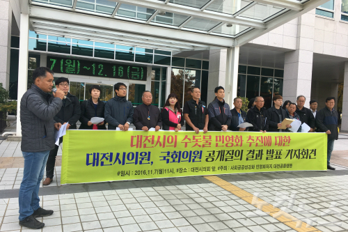 '사회공공성 강화 민영화 저지 대전공동행동'은 이날 대전시의회 앞에서 기자회견을 열고 "이미 서울과 부산, 대구, 울산 등은 국비로 사업을 끝냈고, 인천과 광주 등은 국비 70% 지원을 받아 추진을 하고 있는데, 대전시는 국비 지원 근거가 없다는 허위사실을 유포하며 수돗물 민영화를 강행하고 있다"고 목소리를 높였다.