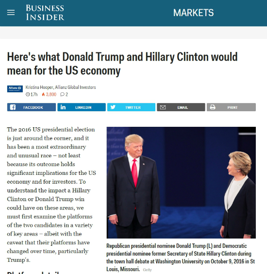현재 여론조사에서 다소 앞서는 힐러리가 승리할 경우 미국의 경제정책은 지금과 별로 달라지지 않으면서 우리 경제에 미칠 영향도 미미할 것으로 보인다.