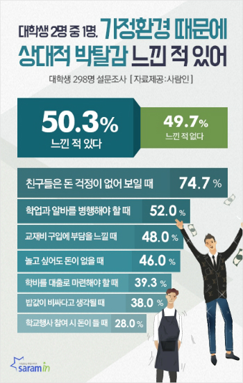 대학생 2명 중 1명은 본인의 가정환경에 따른 상대적 박탈감을 느끼는 것으로 나타났다.