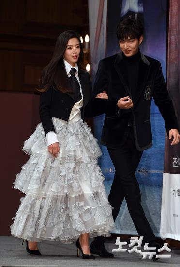배우 전지현과 이민호가 14일 오후 서울 논현동 임피리얼 호텔에서 열린 SBS드라마스페셜 ‘푸른바다의 전설’ 제작발표회에 참석해 무대에 오르고 있다.