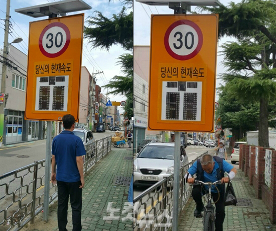 교통사고를 줄이려다 보행 안전사고가 더 자주 발생하겠다는 민원이 제기되자 구청은 부랴부랴 높이를 늘려 속도측정기를 재설치했다.