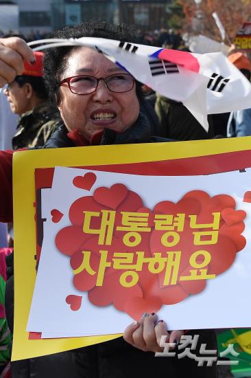 박근혜 대통령 하야를 요구하는 4차 촛불집회가 열리는 19일 오후 서울역 광장에서 박사모(박근혜를 사랑하는 모임)와 보수단체 회원들이 박 대통령 하야 반대 구호를 외치고 있다.