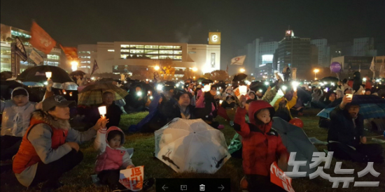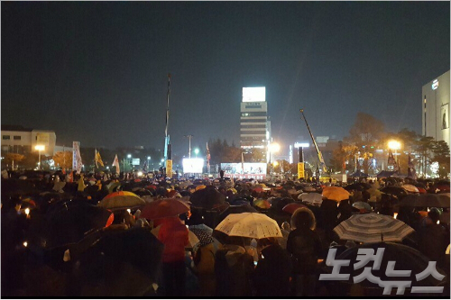 오후부터 내린 비와 쌀쌀한 날씨에도 촛불은 꺼지지 않았다. 지난 4차 시국대회와 비슷한 규모인 1만 명의 시민들이 창원광장을 채우고 촛불을 들고 박근혜 대통령 퇴진을 외쳤다.