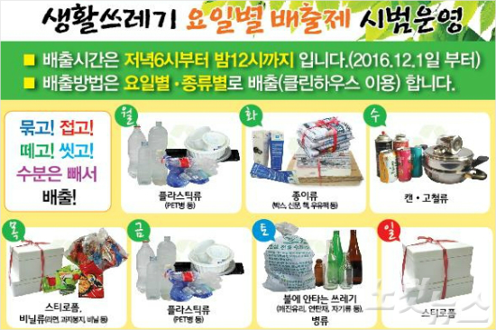 이번에 시행하는 요일별 배출제의 주요 내용은 요일별로 지정된 쓰레기만 정해진 시간 안에 버려야 한다는 점이다.