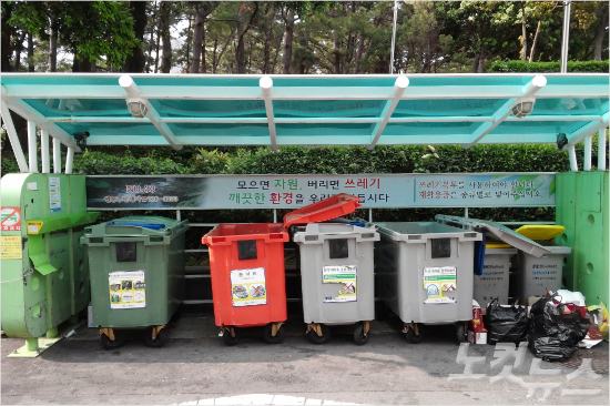 요일별로 수거되는 쓰레기 종류가 달라지기 때문에 주민들은 수거통과 관계없이 빈 통에 요일별로 허락된 쓰레기를 버려야 한다.