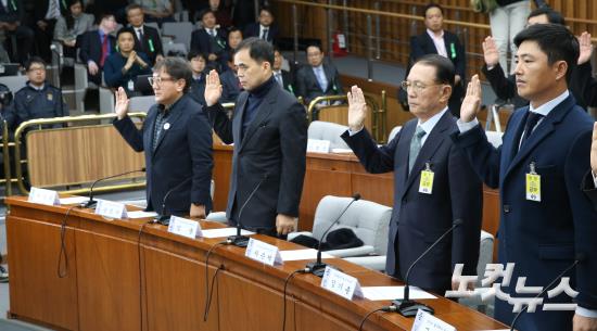 김기춘 전 청와대 비서실장이 7일 서울 여의도 국회에서 열린 박근혜 정부의 최순실 등 민간인에 의한 국정농단 의혹사건 진상규명을 위한 국정조사특별위원회 청문회에 출석해 증인들과 선서를 하고 있다. 오른쪽부터 고영태 전 더블루K 이사, 김기춘 전 청와대 비서실장, 김종 전 문체부 차관, 송성각 전 한국콘텐츠진흥원장.