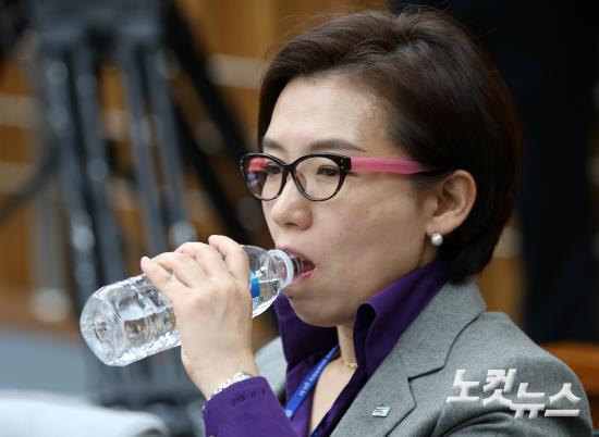 여명숙 게임물관리위원회 위원장이 7일 서울 여의도 국회에서 열린 박근혜 정부의 최순실 등 민간인에 의한 국정농단 의혹사건 진상규명을 위한 국정조사특별위원회 청문회에서 물을 마시고 있다.
