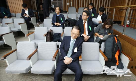 김기춘 전 청와대 비서실자이 7일 오후 국회에서 열린 '최순실 등 민간인에 의한 국정농단 의혹사건 진상규명을 위한 국정조사 특별위원회 청문회'가 정회되자 방청석에 앉아 휴식을 취하고 있다.