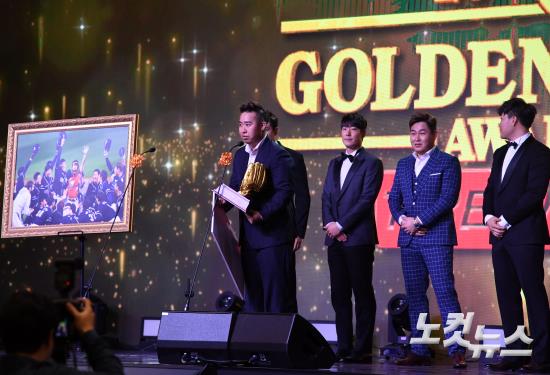 13일 오후 서울 서초구 더케이호텔에서 열린 2016 KBO 골든글러브 시상식에서 골든포토상을 수상한 두산 베어스 선수단이 소감을 말하고 있다.