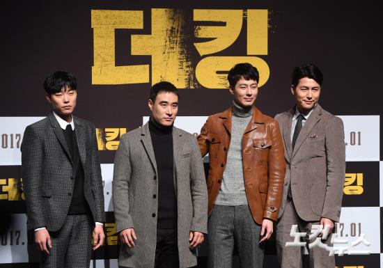 배우 류준열(왼쪽부터), 배성우, 조인성, 정우성이 15일 오전 서울 압구정 CGV에서 열린 영화 ‘더킹’ 제작보고회에 참석해 포즈를 취하고 있다.