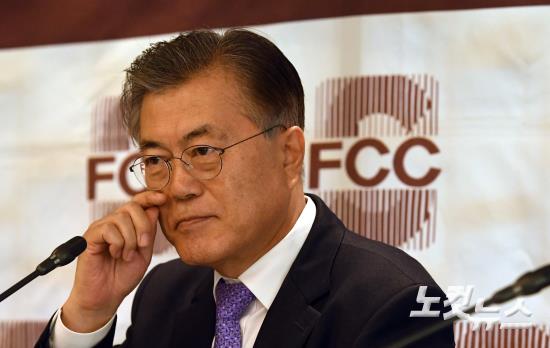 문재인 더불어민주당 전 대표가 15일 오후 서울 태평로 프레스센터에서 열린 외신기자클럽 초청 간담회에 참석해 안경을 올리고 있다.