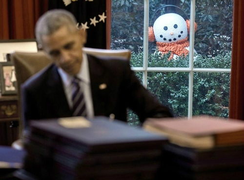 첫 사진은 백악관 뜰인 로즈가든에 장식된 성탄절 눈사람이 멀찍이서 집무 중인 오바마 대통령을 응시하는 모습이 담겼다.