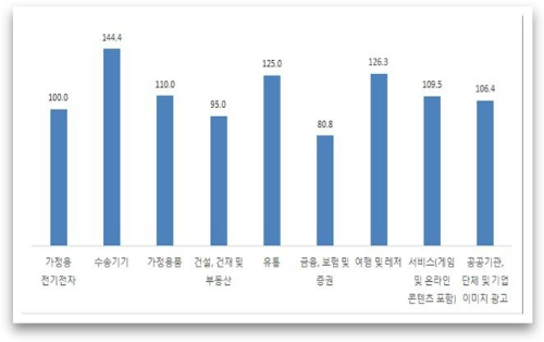 매체별로는 지상파TV 97.0, 케이블TV 103.7, 라디오 98.1, 신문 88.0. 온라인-모바일 136.7로 나타나 전통매체와 뉴미디어 간 시장전망이 희비가 엇갈렸다.